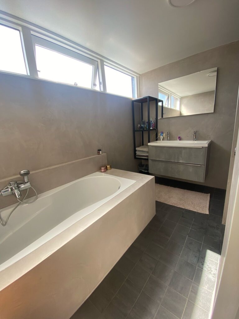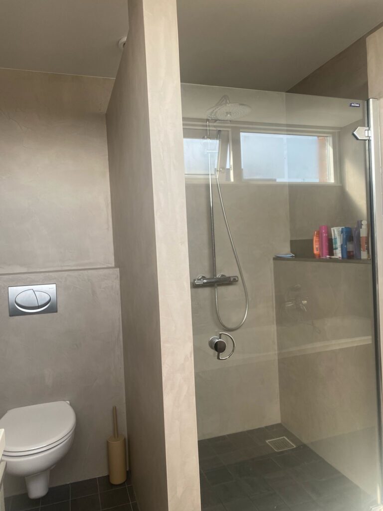 In deze luxe badkamer hebben wij een beton ciré afwerking verzorgd. Het resultaat is een rustige, samenhangende ruimte met een hoogwaardige, minimalistische uitstraling.